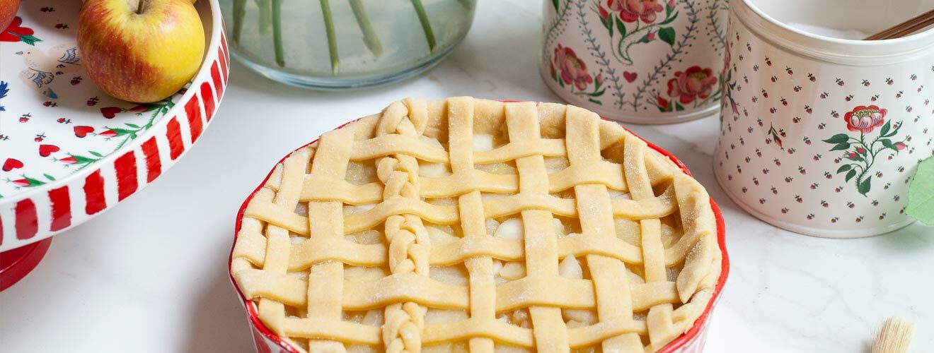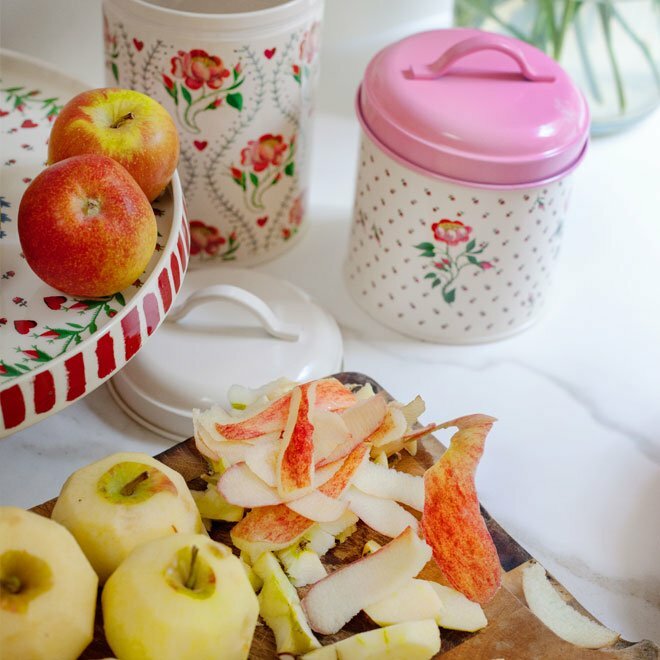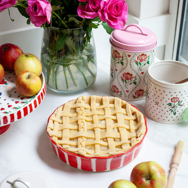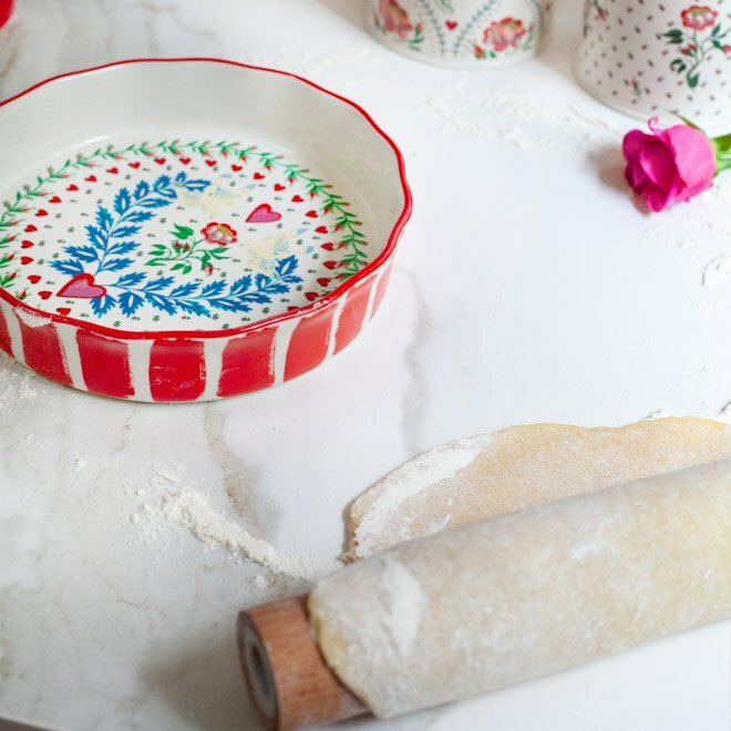 STEP 3將麵團分成兩份 用擀麵棍將麵團擀出與你的 Cath Kidston 烤盤大小接近 輕輕地將麵團放入盤中 再將剛剛放涼冷卻的玫瑰蘋果內餡鋪在裡面 讓內餡擺滿你的烤盤 |