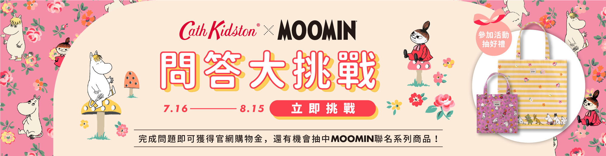 即日起至2021年8月15日23:59止,於Cath Kidston x Moomin指定活動頁參加問答活動,並回填資料即具備抽獎資格,並隨機抽出6位幸運得主,可獲得限定Moomin聯名系列商品。
